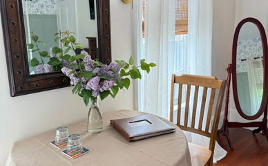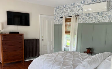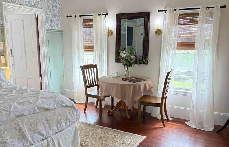 We have taken great care to ensure that each of our guest rooms are comfortable, inviting, and filled with little joys to rejuvenate you after a day of exploring our beautiful community. All of our guest rooms at The Tipsy Butler feature luxury mattresses, Cuddledown© bedding, L.L. Bean bathrobes, streaming HDTV, Amazon Alexa™, mini-fridge, and a coffee & tea station. We also offer a delicious home-cooked breakfast, on-site EV car charging, and usage of our wood-fired sauna is complimentary for our guests.